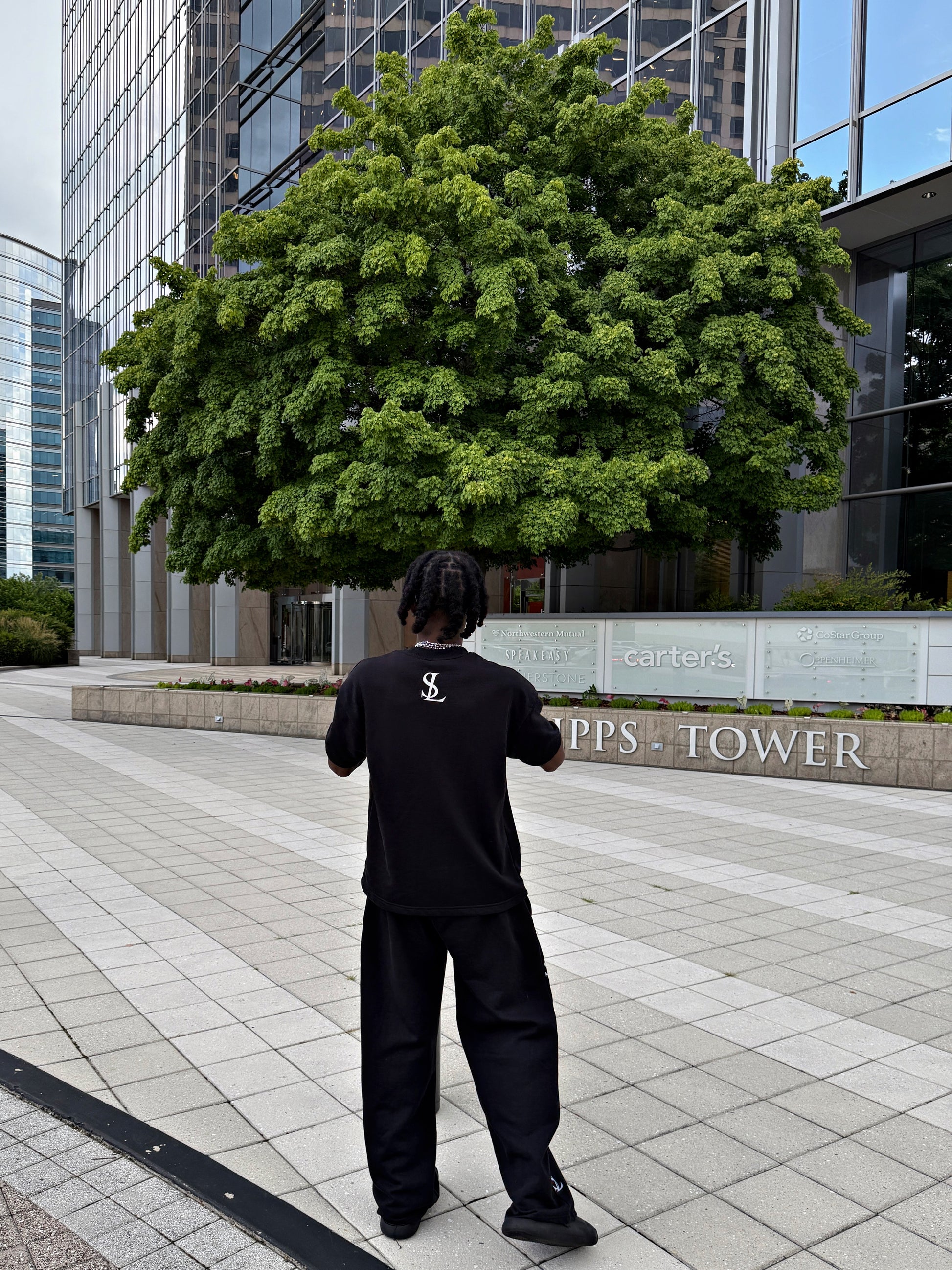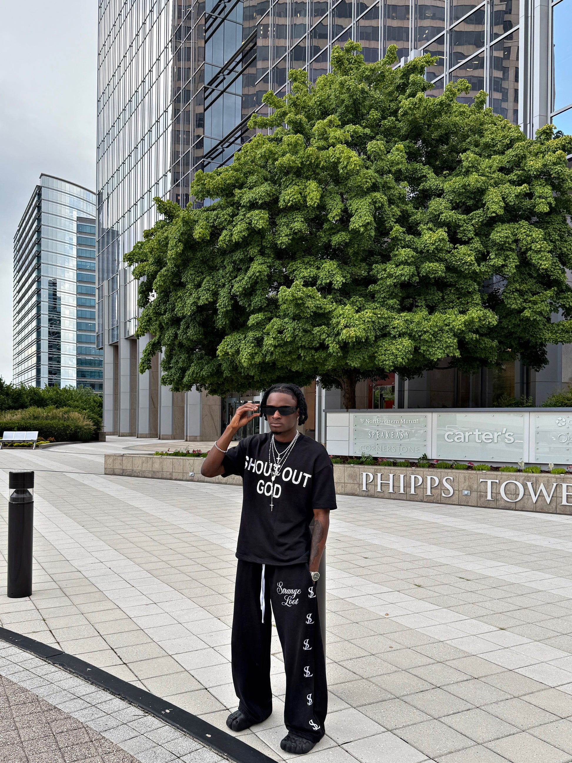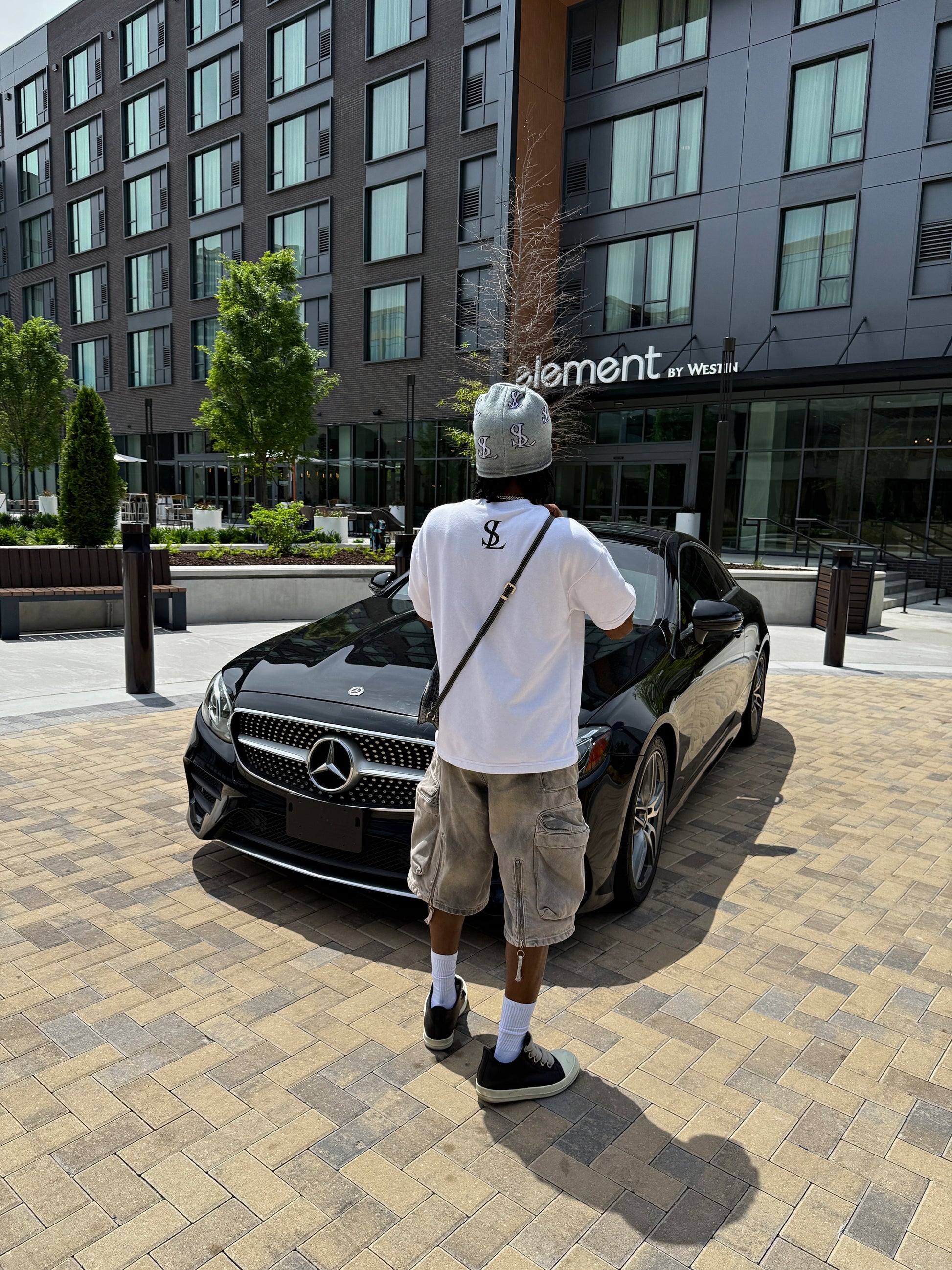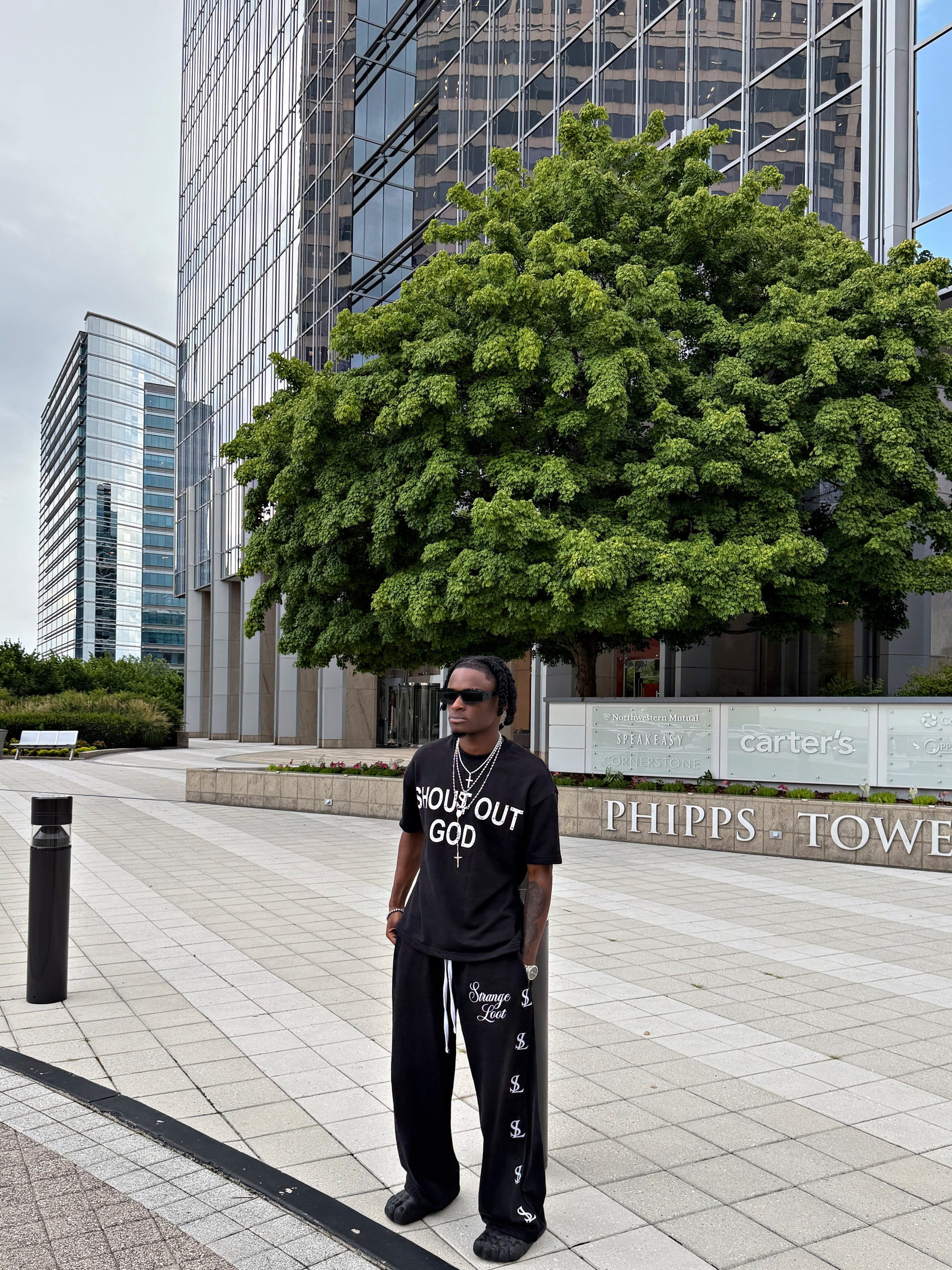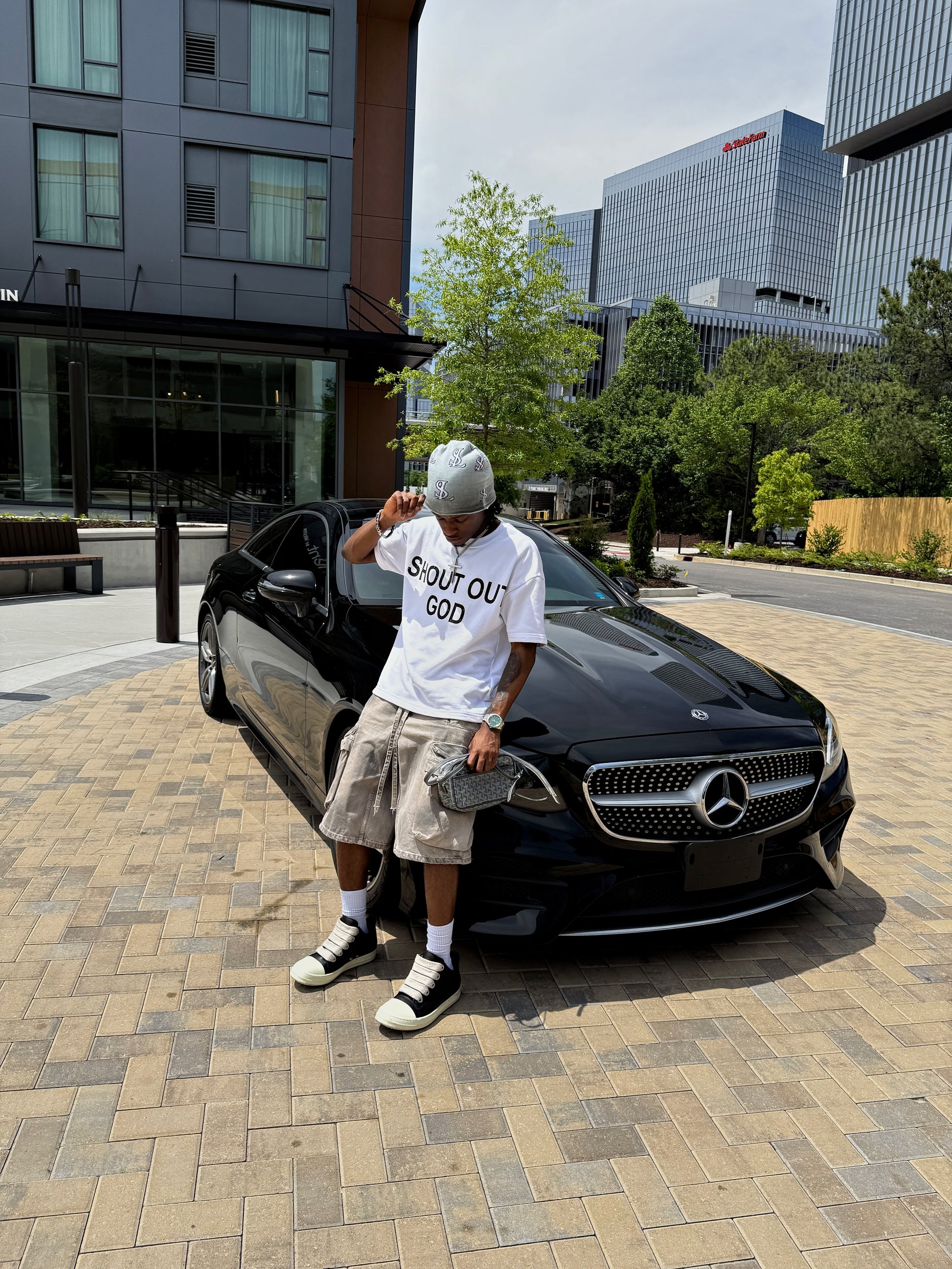 Shoutout God Tee - A statement piece that fuses bold expression with refined craftsmanship. Designed with precision, each letter is meticulously hand-embellished with radiant gemstones, creating a shimmering text that captures both light and attention. The minimalist design is complemented by the discreet "SL" monogram on the back neckline, reinforcing a sense of exclusivity.